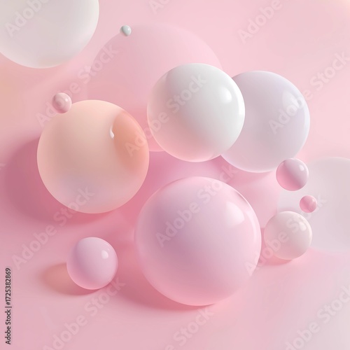 Soft pink abstract bubbles: glossy spheres floating In dreamy pink studio background