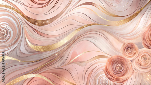 Soft pink and gold abstract waves with floral elements for elegant design or backgrounds concept