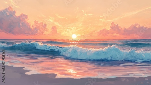 Soft pink and orange hues painting the sky as the sun sets behind rolling waves on a sandy beach.