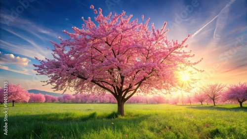 Soft pink cherry blossom tree stands alone in a vast field of vibrant flowers on a warm summer day, with gentle sunlight filtering through the blossoms , natural beauty, flower field
