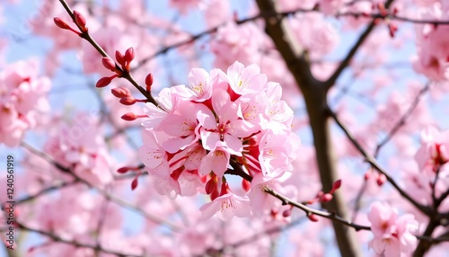 Soft pink cherry blossoms in full bloom against a bright blue sky. Delicate petals capture the beauty of spring and renewal. Ideal for nature, floral, and seasonal themes.