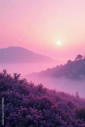 soft pink mist descends on a serene landscape, ethereal gradient, misty dawn