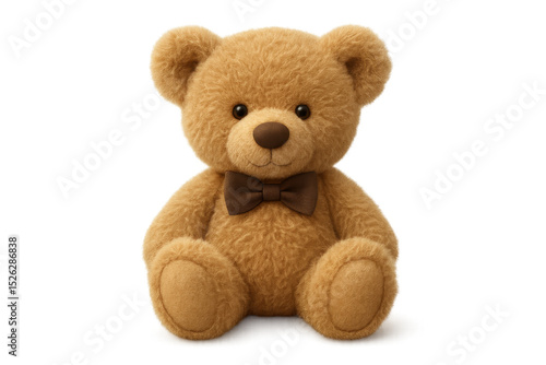 Soft plush teddy bear sporting brown bow tie, conveying childhood sweetness with vintage charm for heartwarming graphic designs and print media