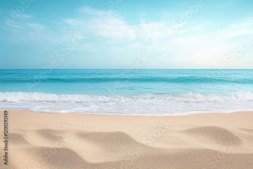 Soft Sand Beach Scene with Blurred Aqua Water and Sky for Summer Relaxation