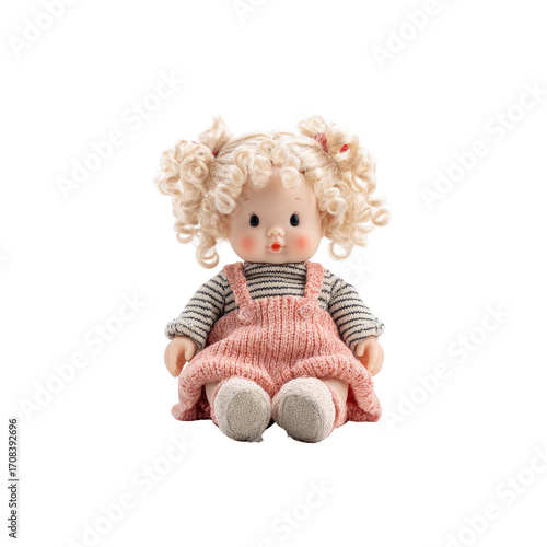 Soft, seated doll with light blonde curly hair, wearing a pink and gray outfit