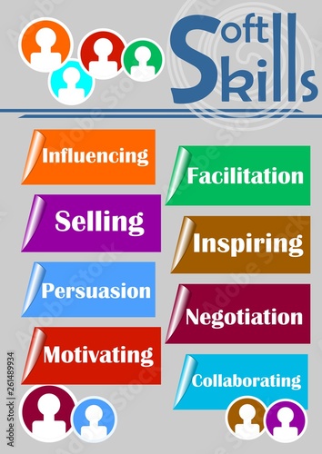 Soft skills theme with labels - influencing, facilitation, selling, inspiring, persuasion, negotiation, motivating, collaborating, multicolored graphic elements on gray background. Vector template