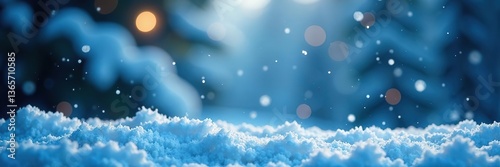 Soft snow falling on blurred blue background with glowing bokeh lights, creating peaceful winter ambiance, background, falling snow