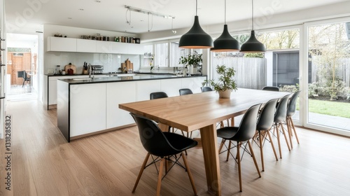 Soft, warm Scandinavian dining area with natural light, a sleek wooden table, and stylish modern chairs.