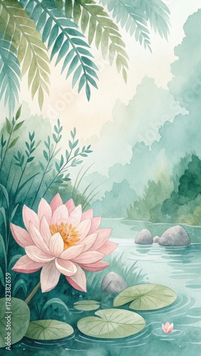 Soft watercolor of a pink water lily in a serene, misty jungle river.