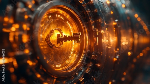 Soft-focus shot of a golden key in a discount-engraved vault door warm glow surrounding it
