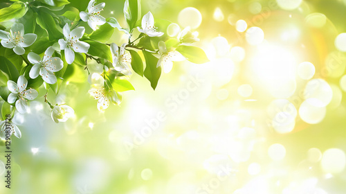Soft-focus spring nature background with white blossoms, green leaves, and golden sunlight bokeh, creating a dreamy seasonal atmosphere perfect for floral themes, wedding invitations, spa designs