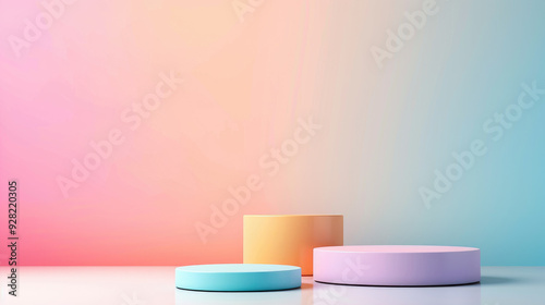 Soft-hued geometric podiums on a minimalist surface, pastel colors blend seamlessly with a gradient backdrop, creating a serene and modern aesthetic.