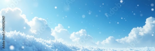 Softly falling snowflakes amidst a serene blue sky with puffy white clouds, sky, blue