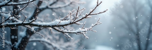Softly falling snowflakes blanket the barren tree branches, serene, monochrome
