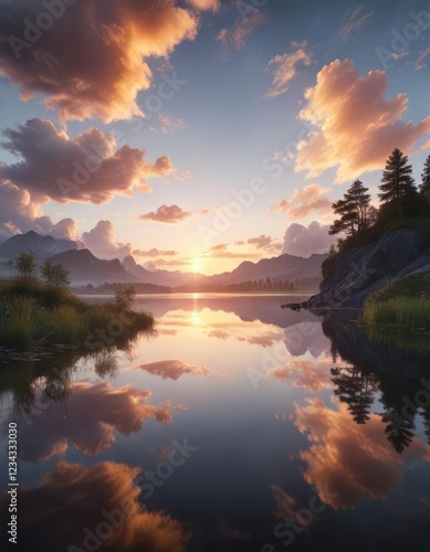 Softly illuminated clouds reflected in a serene lake amidst a sunset landscape, golden hour, lake, set
