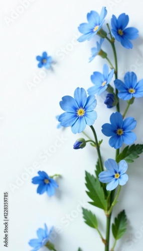 Softly scattered blue forget me nots against a white backdrop, floral, flowers
