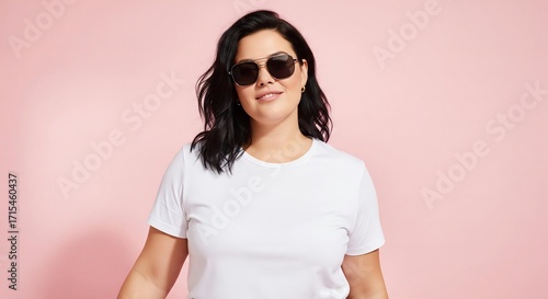 Softly Smiling Plus Size Woman, White Tee and Modern Glasses, Pink Minimalist Scene