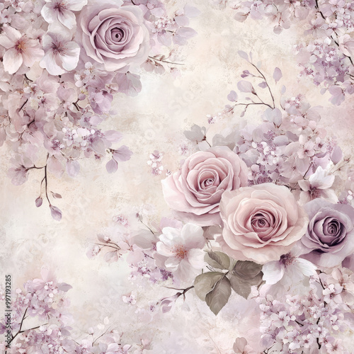 Soft-toned roses and cherry blossoms in blush and pastel lavender, intricately detailed with fine green leaves, creating an elegant floral pattern.