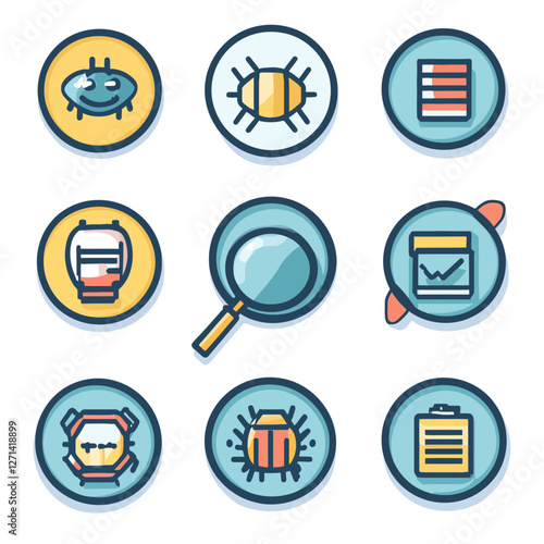 Software Debug Icons: Magnifying Glass, Bug Symbols, Code Review Process
