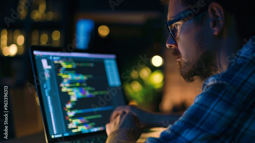software developer working on a laptop showing code on screen