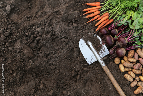 Soil ground texture background with vegetables, autumn harvest, copyspace, harvesting. Bunch of carrot, beetroot and potato in garden, top view with copy space