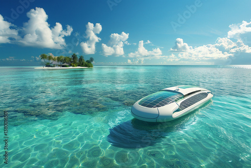 Solar Boat Glides Crystal Clear Ocean Waters Near Tropical Island Paradise