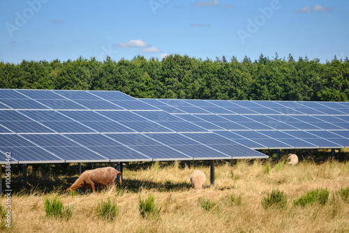solar energy farm in Drenthe, Netherlands with large photovoltaic panels in rural area with sheep