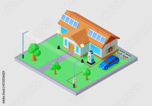 Solar energy. Home panels at roof. Eco battery. Sun power for car charge. Photovoltaic storage. 3D building. Smart charging. Render plastic house isometric view. Vector isolated concept