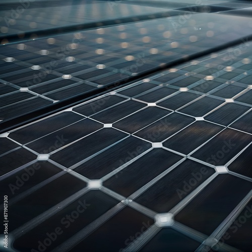 Solar Energy Innovation. Close-up of solar panels with sunlight reflections.