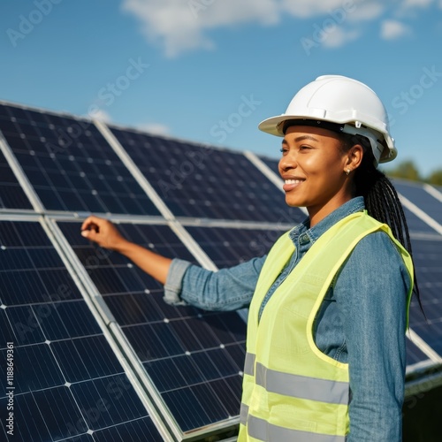 Solar energy technician, hard hat, safety vest, clipboard, solar panels, blue sky, confident smile, professional, renewable energy, sunlight, industrial site, female worker, environmental sustainabili