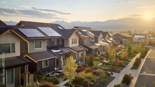 Solar Panel Rooftop community thousands of Solar Panels across the horizon in vast Suburb fighting climate change. AI generated illustration
