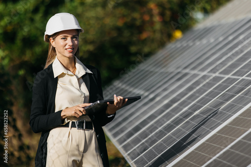 Solar panels and investor with laptop. Business woman with laptop near solar panels. Green energy for home and business