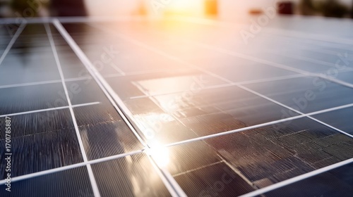 Solar panels basking in warm sunlight during sunrise or sunset,