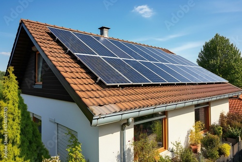 Solar panels on the roof of the house garage. Renewable energy concept.