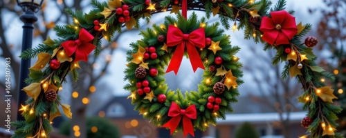 solar powered christmas wreath with eco friendly lights, hanging above a garden arch, decorated with red bows, pine cones, and shimmering led glow.