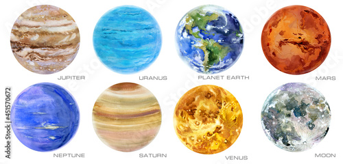 Solar System planets hand drawn watercolor illustration. Earth. Venus. Saturn. Mars. Jupiter. Uranus. Neptune. Moon