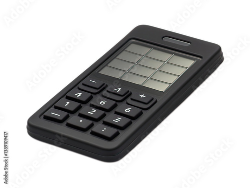 Solar-powered pocket calculator made from recycled plastic, matte black finish with visible solar panel, sustainable office supply on white background