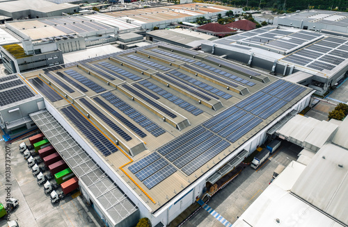 Solar-powered warehouse facility with freight trucks at loading docks. Eco-friendly logistics and efficient cargo transportation. Solar panels and sustainable energy concept in distribution center.