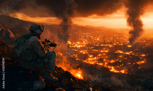 Soldier, city burning, warfare, sunset, hilltop, destruction, apocalypse, game