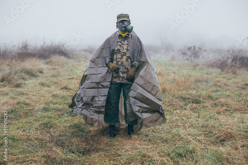 soldier in field wearing gas mask and chemical weapons protection clothing