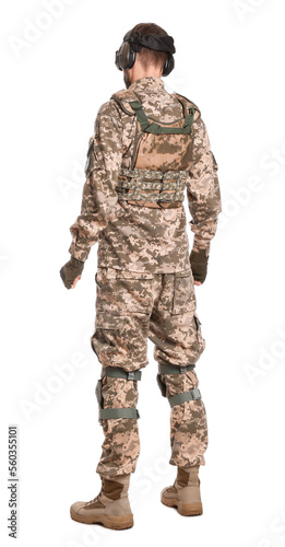 Soldier in Ukrainian military uniform and active tactical headphones on white background