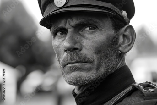 Soldier portrait with decoration, looking stern and proud.