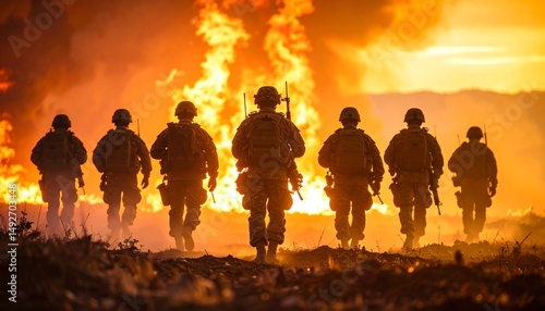 Soldier Silhouettes Walk Towards Fire During Sunset Dramatic Orange Light