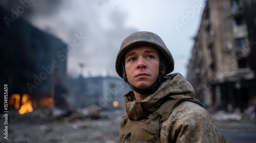 Soldier stands in wartorn city, surrounded by destruction and smoke rising from ruins. atmosphere is tense and somber, reflecting harsh realities of conflict