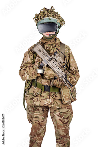 soldier use a VR glasses for combat simulation training. war, army, technology and people concept.