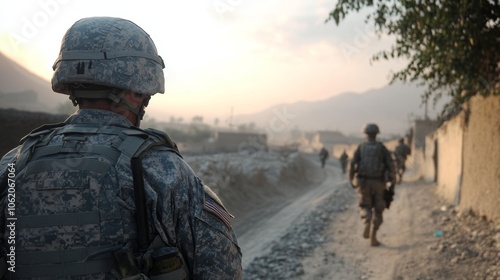 Soldier Walking Down Dusty Road in War Zone