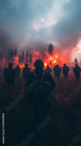 Soldiers march through a field of red poppies towards a fiery, burning landscape under a dark, smoky sky.