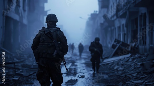 Soldiers Patrolling War-Torn Urban Street in Early Morning Fog