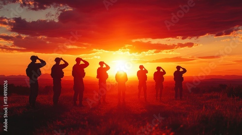 Soldiers saluting with the USA flag at sunset, their silhouettes creating a tribute for Veterans Day.