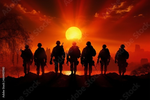 Soldiers silhouettes, designed for duty, against a commanding backdrop